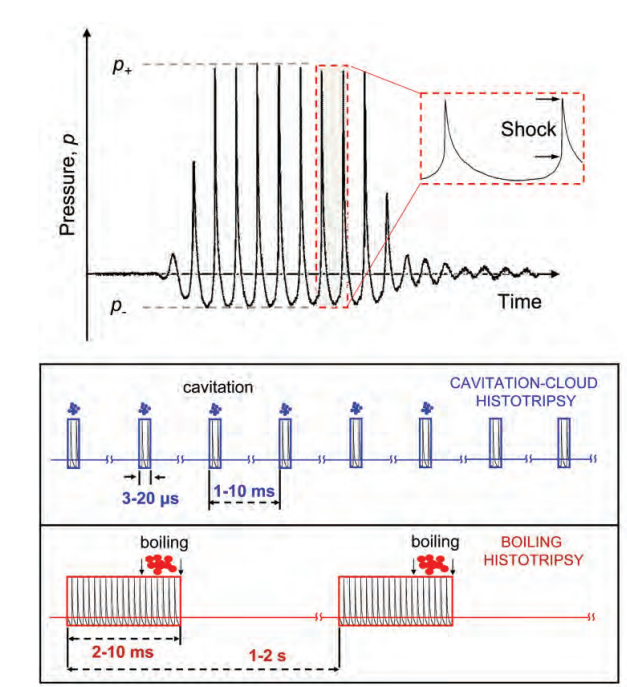 通过调节脉冲强度、脉冲重复周期、脉冲重复频率、占空比等参数,可诱导产生不同的空化泡。依据空化泡产生方式的不同 ,可将PSHT分为空化云型PSHT(cavitation cloud histotripsy,CH)和沸腾型PSHT(boiling histotripsy,BH)。